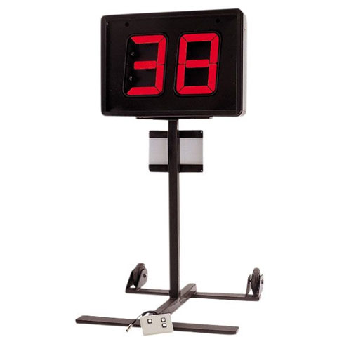 Electroninc race officials (23cm digital LED) readout race lap counter with remote control and steel stand. Battery powered. Portable with wheeled base plate. Suitable for competition track, school sports events, or university use.