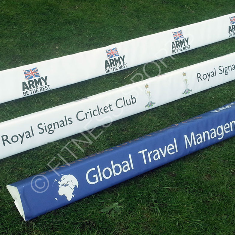 Cricket boundary advertising wedges. Foam triangle inners with PVC covers. (2m long each x 16cm tall). Standard club foam triangle or ECB specification tobleron wedge. Options of wrap around open end vinyls (standard) or seamed ends (open but trimmed) or closed ends (sealed both ends). Complete with your own advertising print on two sides. Sold in packs of ten or fifty. Designed to fit over a boundary rope (with foam rope channel cut included) or placed loose. Ideal for raising club profiles and generating local advertising.