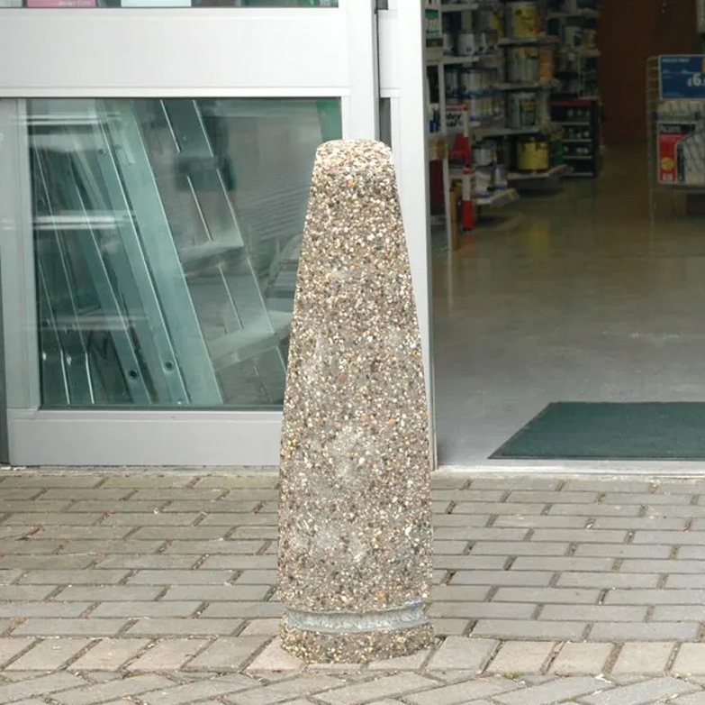 Cast concrete cone shaped post bollard. 75cm tall with exposed aggregate finish and smooth grooved band. Designed to prevent vehicle access to perimeters and buildings. Above ground height: 75cm. Diameter: 22cm. Depth 30cm BX18 3505