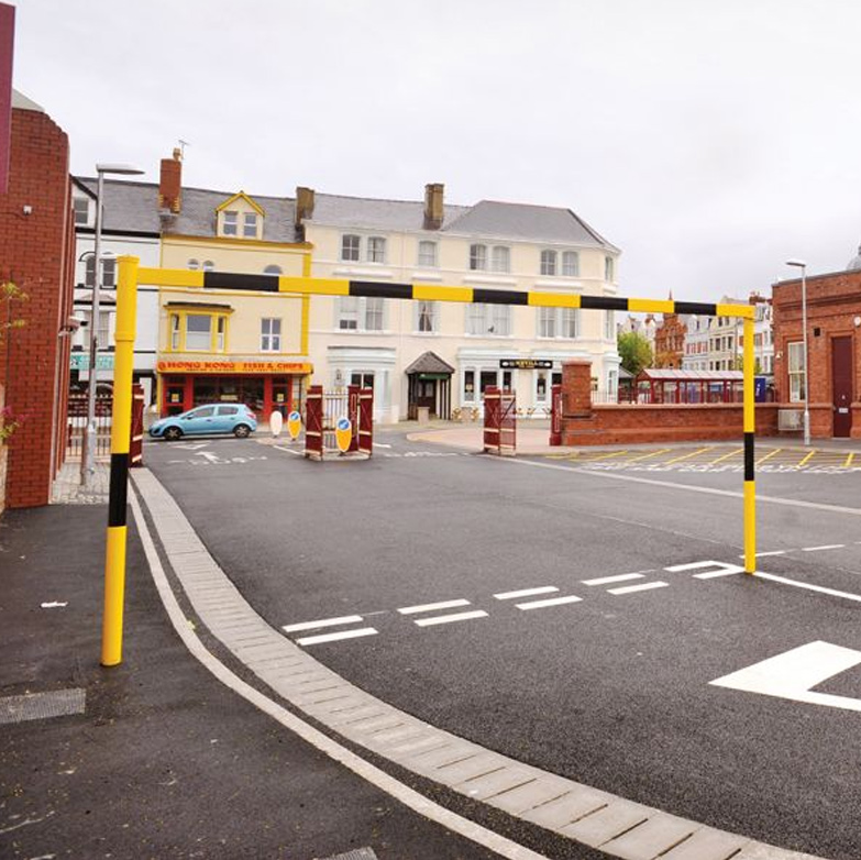 Steel car park height restriction barrier post. Designed to prevent unauthorised entry by high-sided vehicles, HGVs, and coaches, it is commonly specified for car parks, service yards, access roads, and sensitive public realm locations. Manufactured to suit site-specific requirements, the barrier offers clear visual warning and physical restriction. Standard Height: 2100mm under beam. BX01 5522