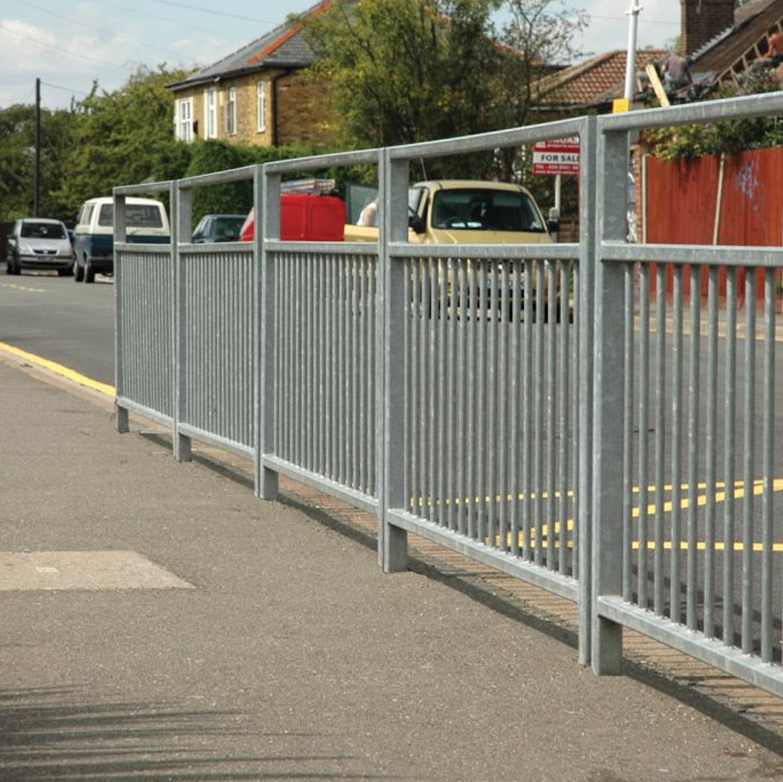 Steel pedestrian safety guardrail barrier fencing. Standard design to provide clear pedestrian segregation while maintaining improved sight lines between the footway and carriageway. Manufactured from 50mm x 30mm box section steel with 12mm infill bars. Above ground height: 94cm. Diameter: 137cm. BX43 4207
